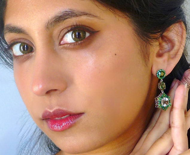 Together, these gemstones create a captivating interplay of rich greens and vibrant hues, set in an artful arrangement that allows each stone to shine while complementing the others. The combination of these high-quality stones creates a sense of opulence and sophistication, making Green Whisper earrings standout addition to any fine jewelry collection.