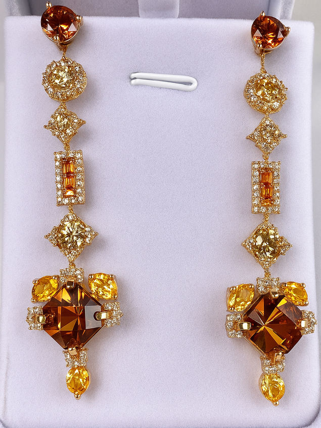Discover the radiant beauty of the Golden Stardust Earrings - a vibrant celebration of color and elegance. These exquisite earrings feature a captivating blend of gemstones, each chosen for its exceptional brilliance and unique hue. At the heart of the design are warm, golden citrines, their sunny glow bringing a cheerful vibrancy to the piece. Adding to its allure are sparkling orange zircons, yellow sapphires, white sapphires and brown diamonds to create a harmonious balance of color and light.